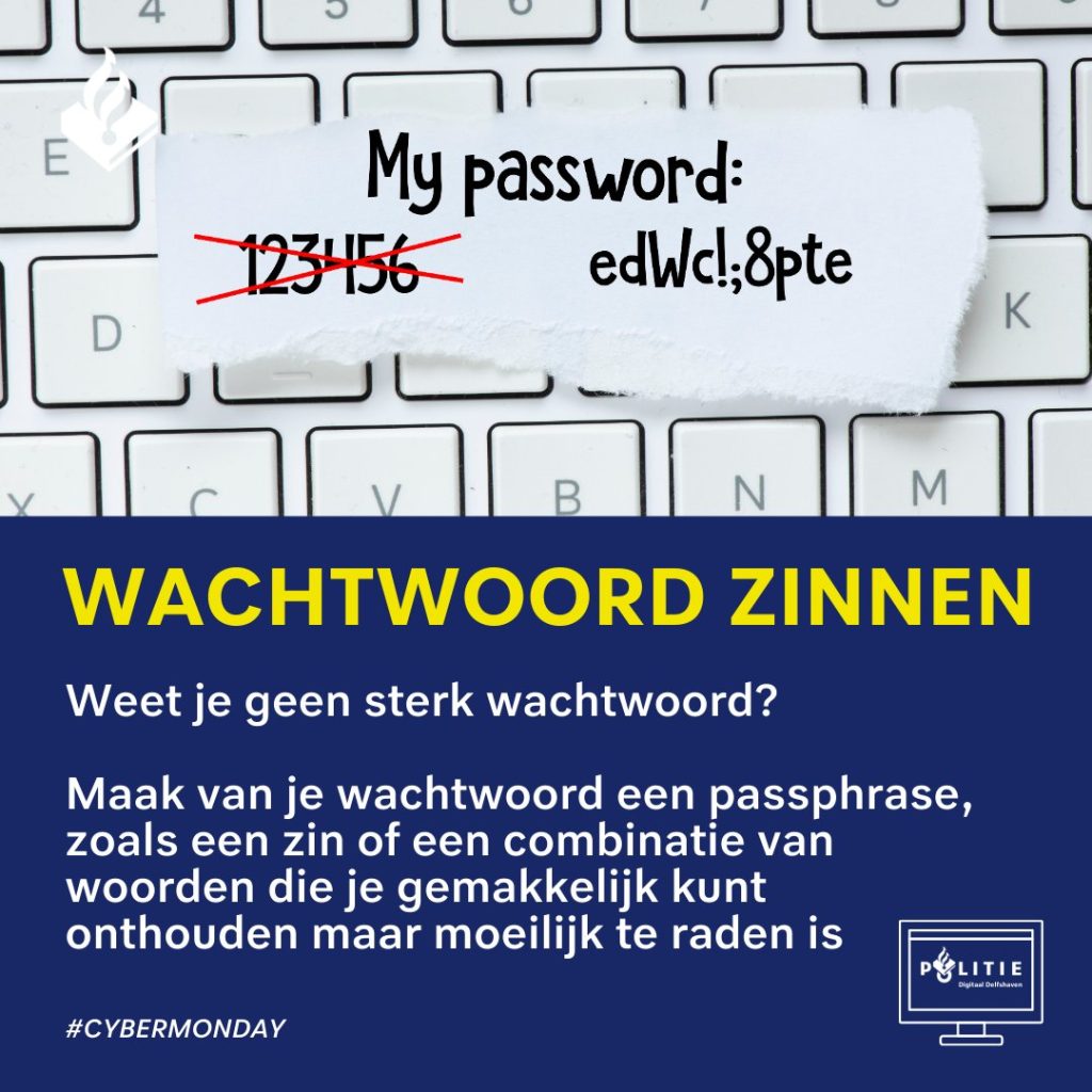 • Gebruik een sterk, uniek wachtwoord: Geen ‘Welkom01’ of je geboortedatum! Gebruik een wachtwoordzin of een wachtwoordmanager.