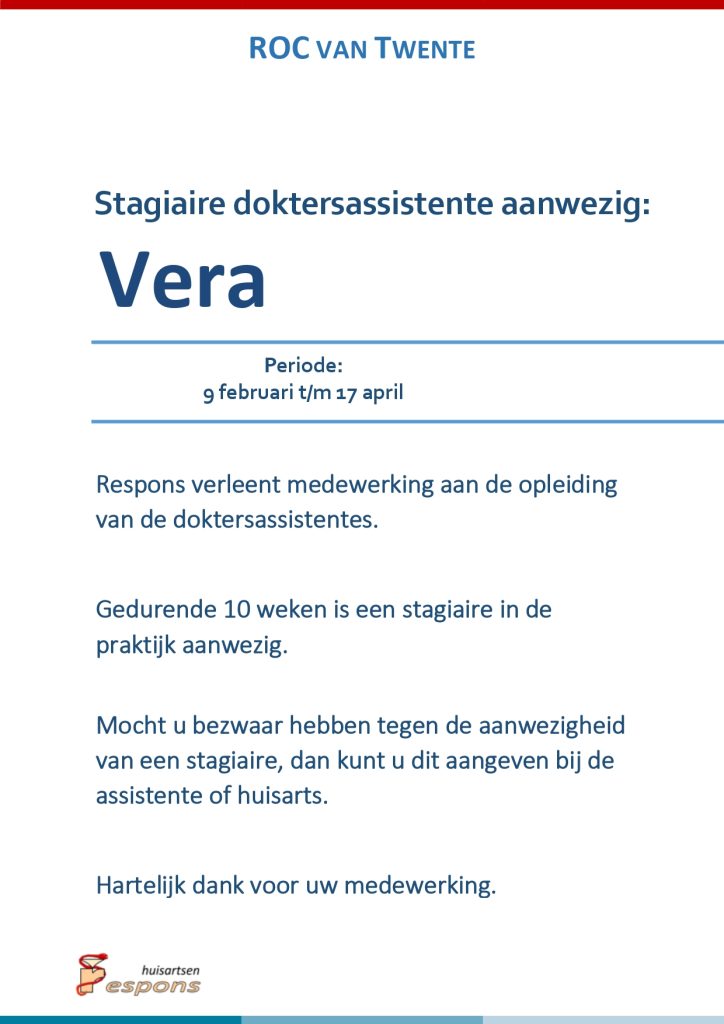 Stagiaire doktersassistente 18 februari 2026𝐑𝐞𝐬𝐩𝐨𝐧𝐬 𝐰𝐞𝐫𝐤𝐭 𝐦𝐞𝐞 𝐚𝐚𝐧 𝐨𝐩𝐥𝐞𝐢𝐝𝐞𝐧 𝐯𝐚𝐧 𝐝𝐨𝐤𝐭𝐞𝐫𝐬𝐚𝐬𝐬𝐢𝐬𝐭𝐞𝐧𝐭𝐞𝐬. Van 9 februari tot 17 april loopt Vera stage in onze praktijk.